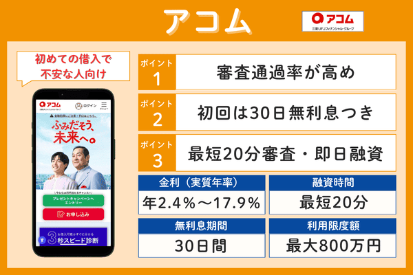 アコムは、三菱UFJフィナンシャル・グループ傘下の大手消費者金融で、「はじめてのアコム」のブランドでも知られています。