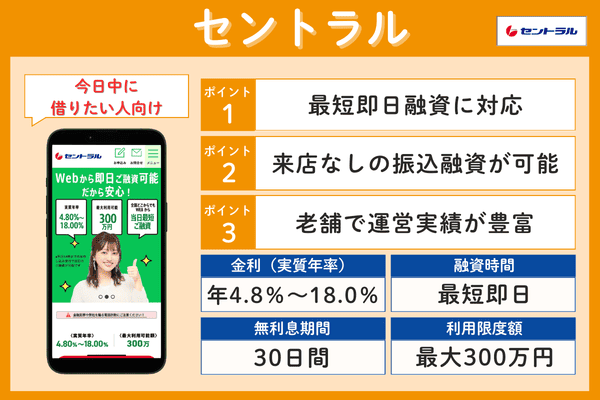 Webで最短15分融資に対応しており、21時(日曜は18時)までに契約が完了すれば当日中の振込も可能です。