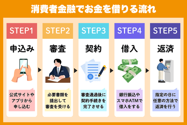 ここでは、実際の利用手順に沿って、消費者金融で借りるまでの流れを5つのステップで解説します。