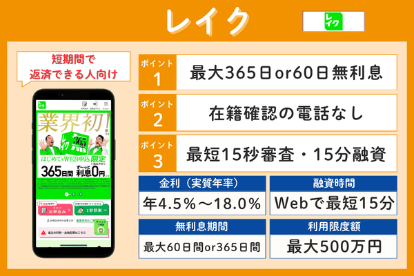 レイク年4.5%~18.0%最短15秒最大60日間or365日間最大500万円