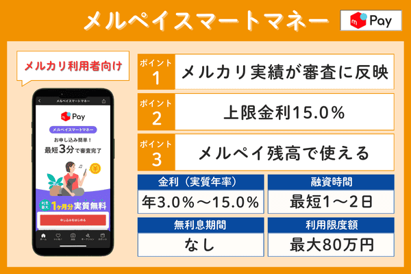 メルペイスマートマネー年3.0%~15.0%最短1~2日なし最大80万円