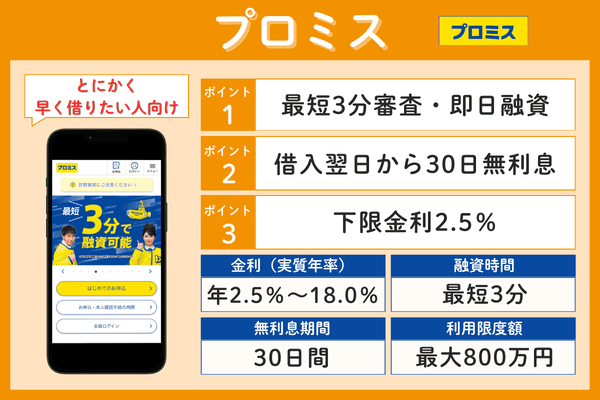 プロミス年2.5%~18.0%最短3分30日間最大800万円