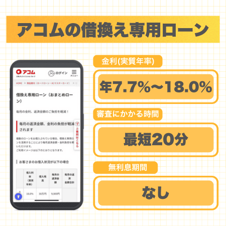 アコムの借換え専用ローン | 7.7%~18.0% | 1万円~300万円 | 最短20分 |