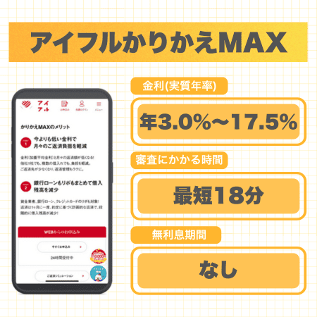 アイフルかりかえMAX | 3.0%~17.5% | 1万円〜800万円 | 最短18分 |