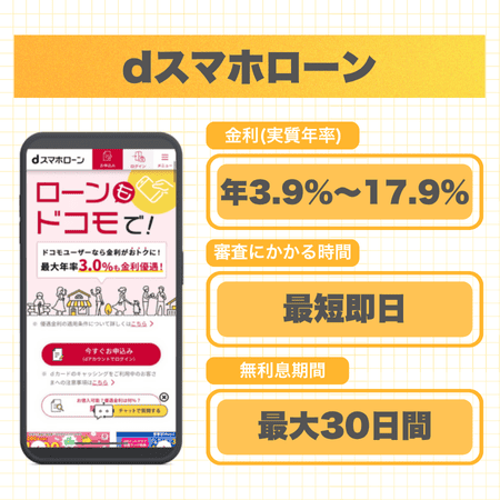 dスマホローン | 3.9%~17.9% | 1万円~300万円 | 最短即日 |