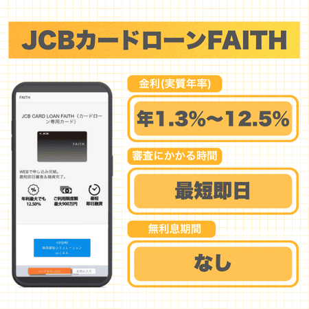 JCBカードローンFAITH | 1.3%~12.5% | 5万円~900万円 | 最短即日 |