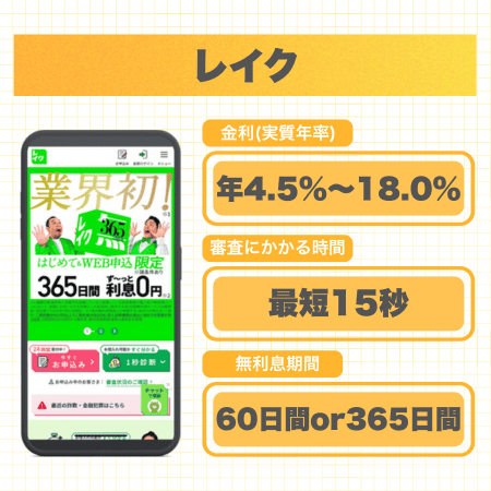 レイク | 4.5%〜18.0% | 1万円〜500万円 | 最短15秒で結果を通知 |