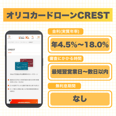 オリコカードローンCREST | 4.5%〜18.0% | 10万円〜500万円 | 最短翌営業日〜数日以内 |