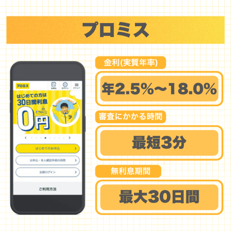 プロミス | 2.5%~18.0% | 1万円~800万円 | 最短3分 |